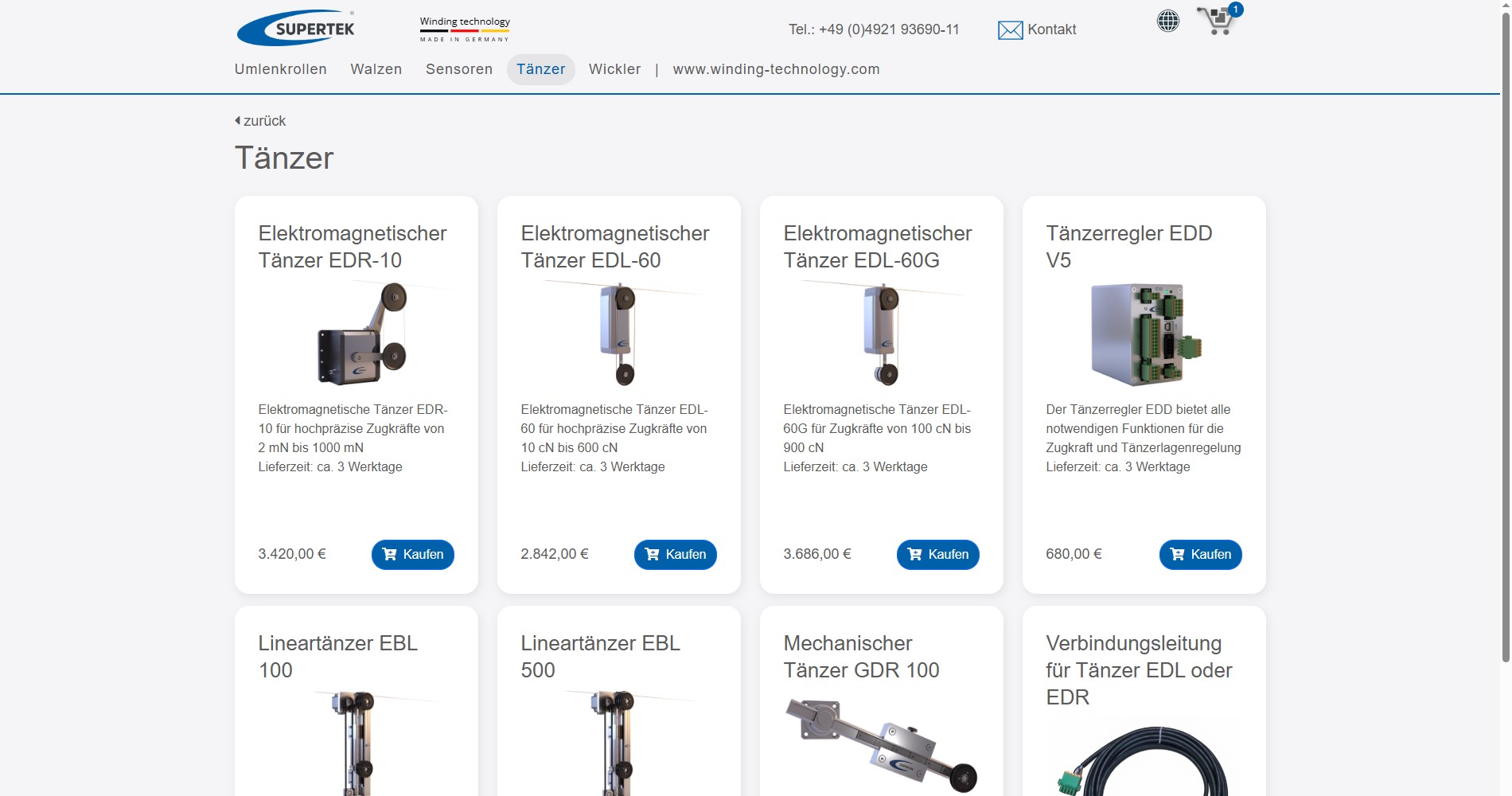 Es handelt sich um einen Shop mit technischen Produkten und Zubehör wie Umlenkrollen, Walzen, Sensoren, Tänzer und Wickler.